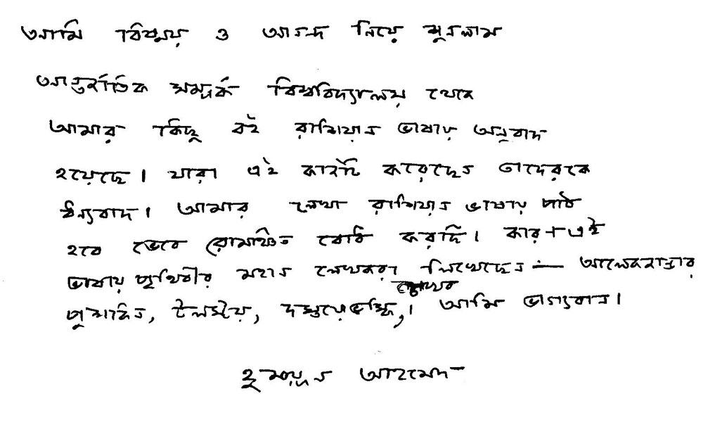 Я узнала имя Хумаюна Ахмеда в 2000 г., когда случайно мои московские друзья – бангладешцы дали почитать несколько его повестей и рассказов. Тут я поняла: вот он, мой союзник в деле преподавания бенгальского языка и пропаганды бенгальской культуры среди молодого поколения – моих студентов, изучающих бенгальский язык в МГИМО. Мы начали читать его произведения на втором курсе и занимались этим во время всех лет учебы. Отважились взяться за перевод. Читали студенты с восторгом, а переводили с азартом. И хотя художественный перевод не входит в программу нашего почтенного учебного заведения, я понимала, что не трачу времени зря. Чем дольше студенты работали над переводом книг Х. Ахмеда, тем глубже проникали в логику языка, в психологию народа, чьим отражением язык и является, а главное – тем больше симпатизировали людям, которые живут, влюбляются, горюют, радуются, плачут, шутят, умирают в этой далекой и почти никому не известной Бангладеш. Результатом наших усилий явились две публикации в журнале «Чётки» и изданные крошечным тиражом две небольшие книжки «Из Бангладеш с любовью» и «Бродяга из Дакки, или Истории из жизни Химу, рассказанные им самим». Выход обеих книг сопровождался их презентацией в Центре восточной литературы Российской государственной библиотеки, на которых присутствовал посол Бангладеш и много других гостей, бенгальцев и русских. Мы открыли «Клуб Химу», членами которого могут стать все, кто полюбил бенгальскую литературу и симпатичного героя повестей Х. Ахмеда, носящего это странное не только для русских читателей имя. Единственным условием принятия в клуб является готовность приходить на его заседания в желтых, как у героя, рубашках. Кстати, эта готовность говорит о многом, прежде всего – о внутренней раскованности, ребячливости, незакомплексованности и, конечно, о чувстве юмора – качествах, без которых и вовсе не стоит читать Хумаюна Ахмеда. Сам автор недавно давал интервью ВВС и с радостью поделился новостью о том, что его не только знают и переводят в далекой России, но и открыли там клуб друзей его героя. «А главное, – сказал он интервьюеру, – вы только представьте: они приходят туда в желтых рубашках!» Значит, мы угадали: и для автора желтая рубаха тоже – знак непосредственности, искренности и открытости, готовности принять новую культуру.