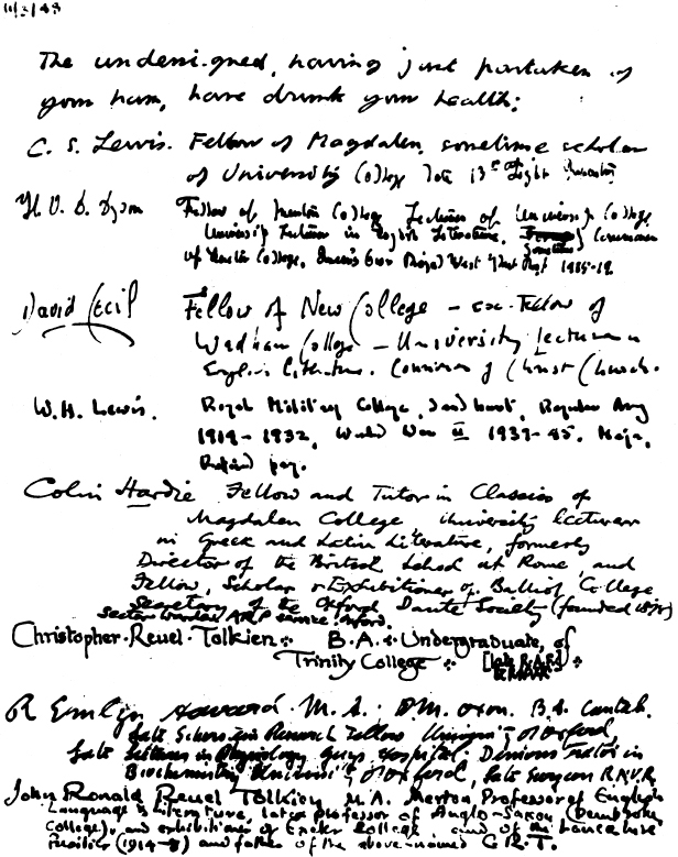 Signatures of some of the Inklings, sent to Dr Warfield M. Firor in 1948, after he had given them a ham (by permission of the Trustees of C.S. Lewis)