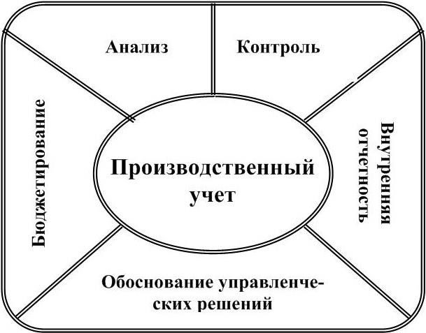 Однако при ведении производственного учета основной упор делается на учетные процедуры. Управленческий же учет не ограничивается только учетными процедурами, а через функции управления он превращает производственный учет, по существу, в интегрированную систему внутрихозяйственного учета затрат и доходов организации. Производственный учет является базой управленческого учета. Он необходим менеджерам для принятия оперативных производственных решений. Кроме производственного учета управленческий учет включает бюджетирование, управленческий анализ и контроль деятельности организации и ее подразделений (центров ответственности), обоснование управленческих решений, а также составление внутренней отчетности (рисунок 1.3).