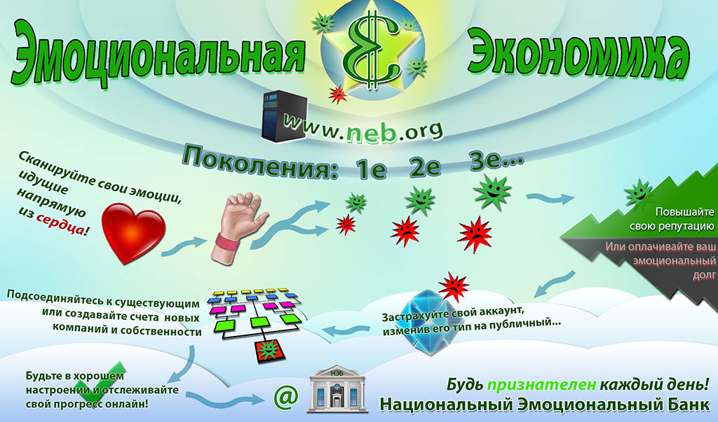 Хотелось бы Вам жить в мире, в котором нет налогов, материальных затрат при производстве, войн, преступности, коррупции, и где у всех и каждого есть одна общая черта – эмоциональная любовь?[1] Мир, в котором естественные эмоции являются ценностью, вполне реален. Это тот же мир, в котором мы сможем стать независимыми от глобального влияния других валют и чужих ценностей. В начальном и переходном этапах мы сможем построить гибридную экономику с двумя принципиально разными валютами. В идеале, в будущем, не будет необходимости в налогообложении и любых других механизмах экономического регулирования, потому что это будет либо уже тот новый мир, к которому мы стремимся, либо развитая гибридная экономика. Оптимальной всеобъемлющей политической системой при такой эмоциональной и моральной экономике будет являться «Э-Капитализм», в границах которого могут сосуществовать разные политико-экономические структуры. Так давайте же рассмотрим более детально, что подразумевает под собой этот новый мир. Добро пожаловать в ЭЭ![2]
