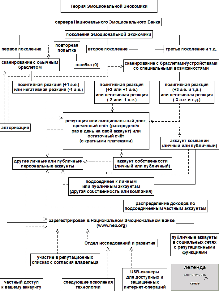 Существуют позитивные и негативные эмоциональные реакции, которые могут быть распознаны. Остроконечный интерстициальный интервал на электрокардиограмме (ЭКГ) негативен, а сглаженный позитивен, что отображено в нейрокардиологических исследованиях и технологиях Института математики сердца (HeartMath® Institute) или ИМС[3] (МакКрати, 2001, стр. 18–19, 44). Представьте удобный браслет, плотно прилегающий к вашей руке, который может считывать Ваш пульс электронным сканером, а также подсоединяться к Вашему личному счёту в Национальном Эмоциональном Банке (НЭБ), который авторизует транзакции. В качестве уникальной идентификации в целях безопасности Ваш браслет будет использовать неповторимость Вашего сердечного пульса (например, браслет компании Nymi, Торонто, Канада). Для оплаты необходимо «сказать спасибо» напрямую отсканировав свои эмоции или отправив их на публичный счёт, использовав специальный интерфейс. Когда кто-то платит Вам напрямую, Ваша репутация растёт от позитивных эмоций или понижается от негативных.
