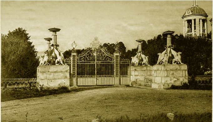 Чугунные ворота у въезда в усадьбу Кузьминки. Фото начала XX в.