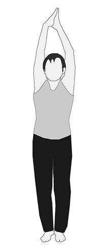 Исходное положение – стоя, ноги прямые, стопы вместе. Встаем на пальцы стоп, выталкиваем корпус пальцами стоп вверх. Прямые руки поднимаем над головой и тянемся руками вверх. Всем телом вытягиваемся вверх вместе с руками. Пальцы стоп сильные, пятки поднимаем как можно выше (РИС. 1).
