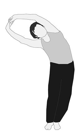 Исходное положение – стоя, ноги прямые, руки вверх, пальцы рук в замок. Вытягиваясь вверх корпусом и руками, на выдохе делаем наклон вправо, дыхание не задерживаем, дышим нормально. Выпрямляемся на вдохе и на выдохе, с вытяжением вверх корпусом и руками, делаем наклон влево. На вдохе выпрямляемся (РИС. 2).