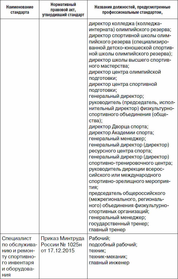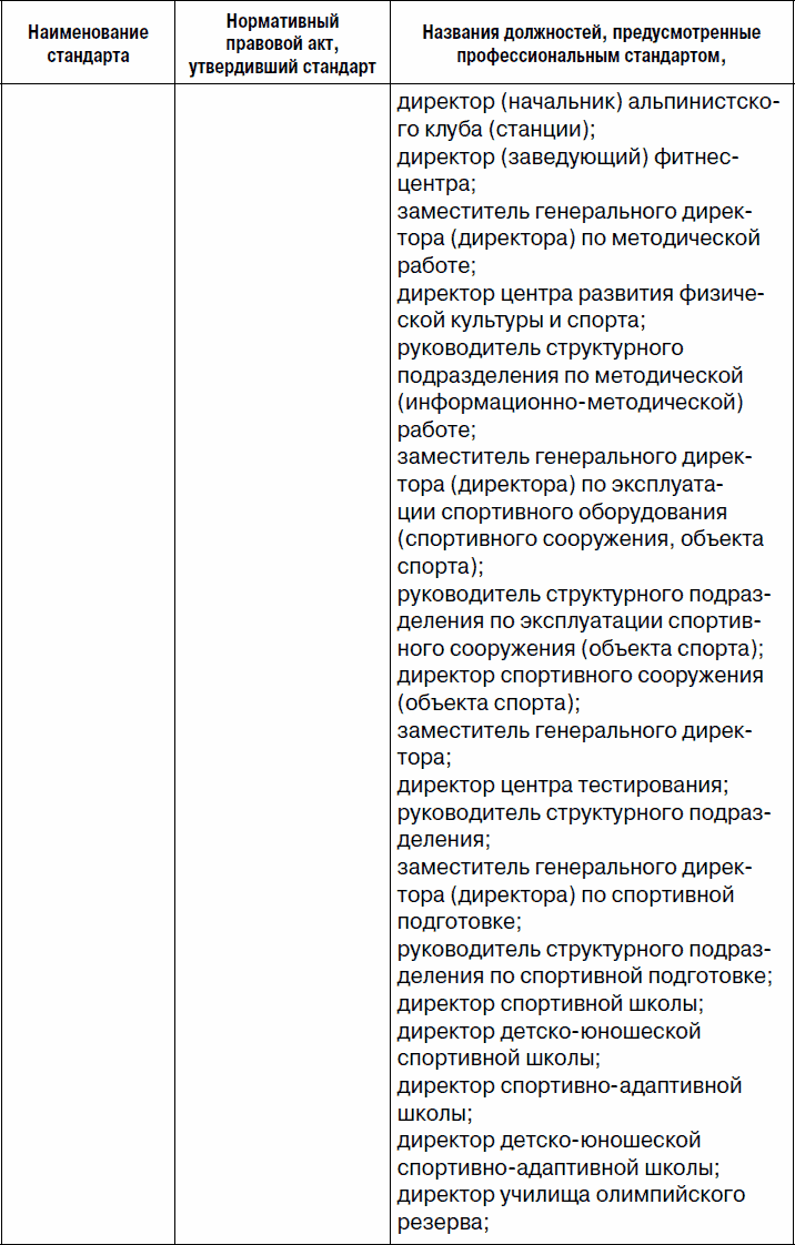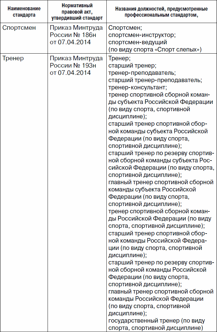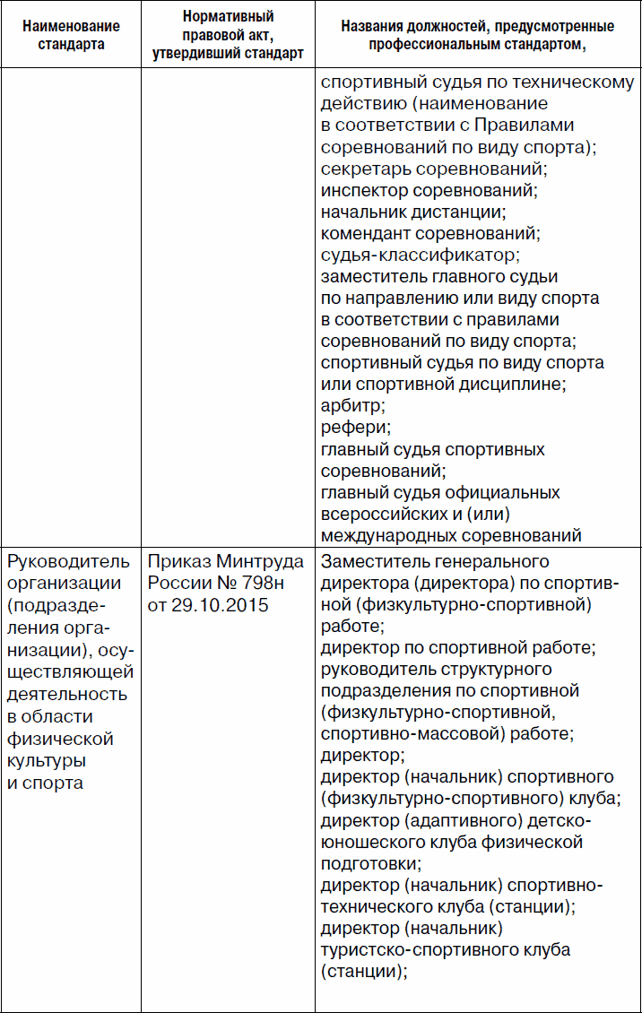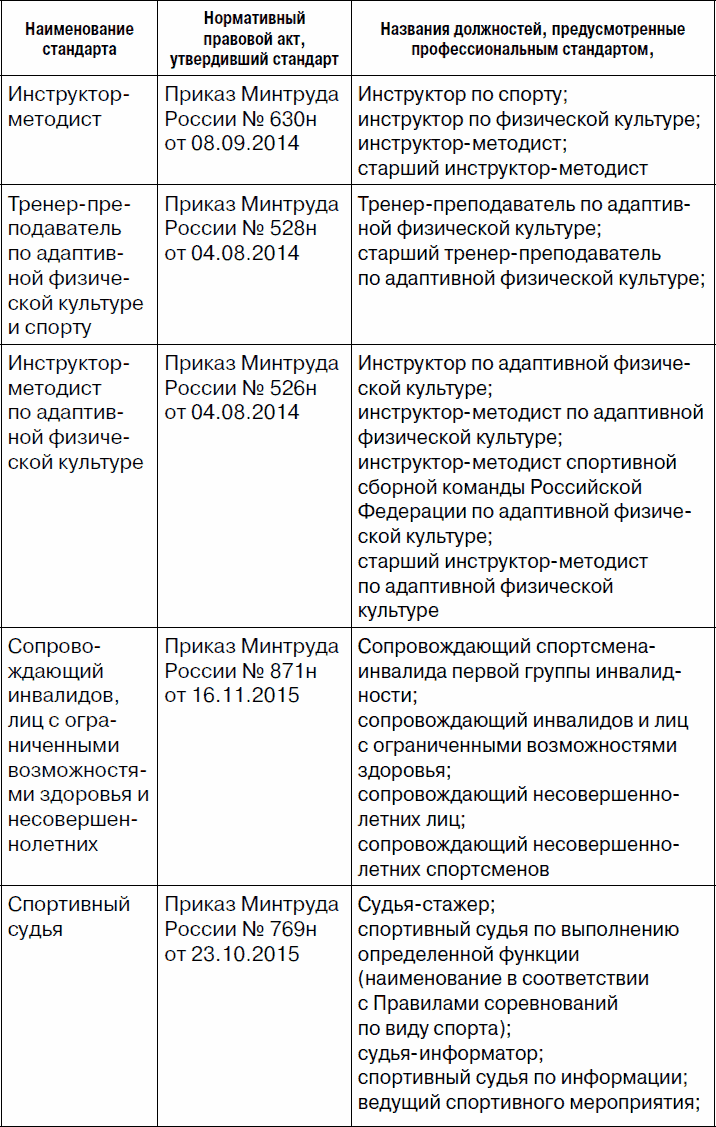 Для организаций, осуществляющих деятельность в области физической культуры и спорта, рекомендуется использовать соответствующие разделы Единого квалификационного справочника должностей руководителей, специалистов и служащих (раздел «Квалификационные характеристики должностей работников в области физической культуры и спорта», утвержденный приказом Министерства здравоохранения и социального развития Российской Федерации от 15 августа 2011 года № 916н, и раздел «Квалификационные характеристики должностей работников образования», утвержденный приказом Министерства здравоохранения и социального развития Российской Федерации от 26 августа 2010 года № 761н), а также следующие Профессиональные стандарты (табл. 1).