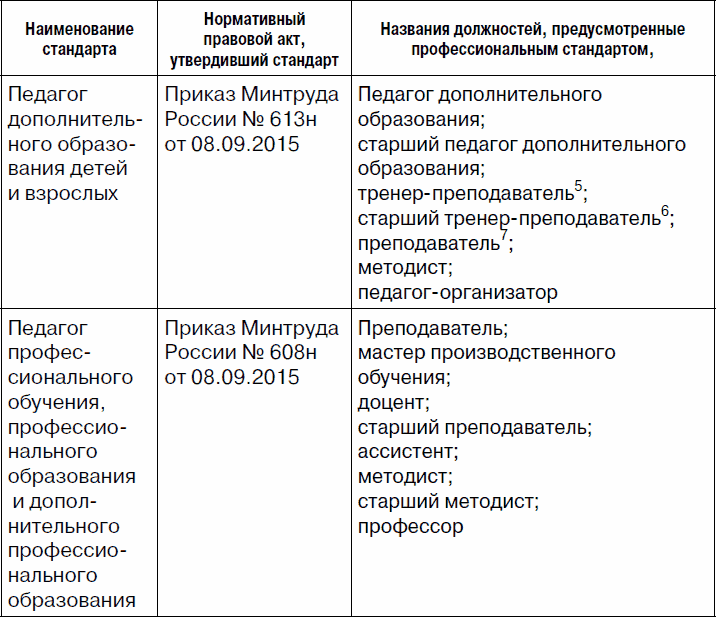 Следует обратить внимание, что согласно Профессиональному стандарту «Педагог дополнительного образования детей и взрослых» наименование должности «тренер-преподаватель» используется при реализации дополнительных предпрофессиональных образовательных программ в области физической культуры и спорта[9].