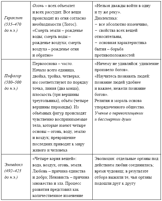 – ранняя классика – онтологический принцип моноплюрализма (первоначало мира: вода – по Фалесу, огонь – по Гераклиту, атомы – по Демокриту);