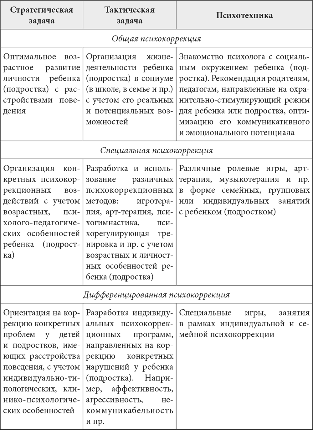 Каждая модель психологической коррекции имеет свои стратегические и тактические задачи и психотехнические приемы. Рассмотрим их на примере психологической коррекции детей с расстройствами поведения [Мамайчук, Смирнова, 2014] (табл. 4).