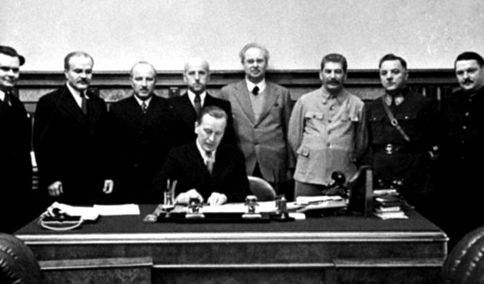 Подписание министром иностранных дел Литвы Ю. Урбшиком советско-литовского договора о передаче Литовской республике города Вильно и Виленской области. На снимке: И.В. Сталин, В.М. Молотов, В.П. Потемкин, К.Е. Ворошилов, А.А. Жданов и представители правительственной делегации Литвы, 10 октября 1939 года