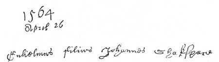 В приходском списке протестантской церкви в Стратфорде находится следующая отметка: «1564; April 26: Gulielmus filius lohannes (вместо lohannis) Shakespeare», – подразумевается, крещен.