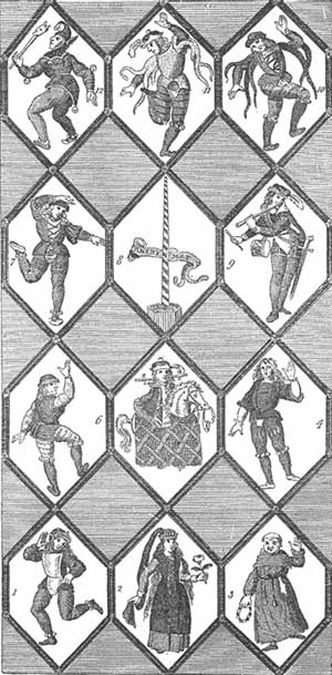 «Старая веселая вдова (Old Merry England)» майские обряды и увеселения; мавританский танец (Morris Dance), деревянная лошадка, монах Тук, клоуны, музыканты и т. д. (живопись на окошке старинного дома Джоржа Толлета в Стафордшире). Гравюра из Беллевского изд. Шекспира (1785)