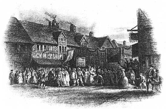 Празднование 200-летия юбилея Шекспира в 1764 году. Устроена знаменитым актером Гарриком процессия направляется к дому, где родился Шекспир.