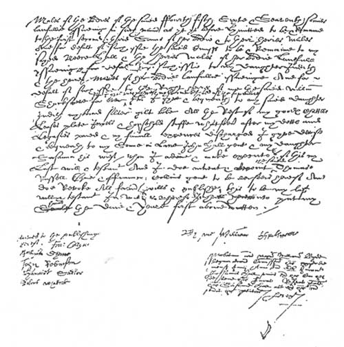 Три подписи на трех листах, сделанные позже рукой больного, две ранние на деловых документах и одна может быть также подлинная, на томе сочинений Монтеня – единственные автографы Шекспира.