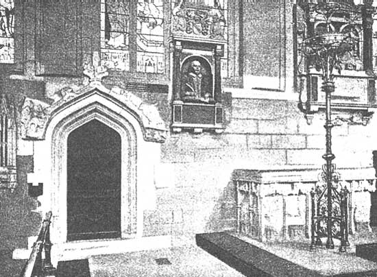 Плита над могилой Шекспира и бюст в алтаре Стратфордской церкви св. Троицы