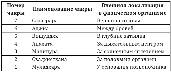 Здесь дана локализация чакр в их близости к анатомическим органам. В физиологическом строении тела отражаются внешние проявления чакр, причем именно вдоль позвоночного столба и головы.