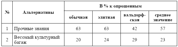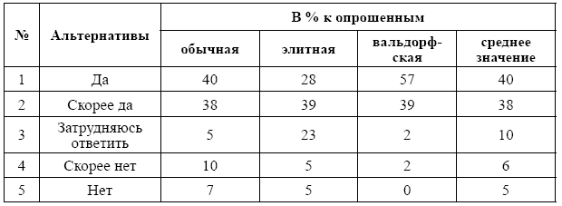 Старшеклассники вальдорфской школы придерживаются несколько иной позиции. С их точки зрения, школа в первую очередь должна заботиться о развитии способностей учащихся. Так ответили 56 % опрошенных учеников вальдорфской школы. Еще 52 % считают, что школа должна давать опыт общения с другими людьми, и только 42 % отметили, что школа должна давать прочные знания. Таким образом, учащиеся вальдорфской школы ждут от нее не столько помощь в овладении знаниями, сколько всесторонней подготовки к будущей взрослой жизни, включающей коммуникативные умения и навыки, а также развитие личности учащихся.