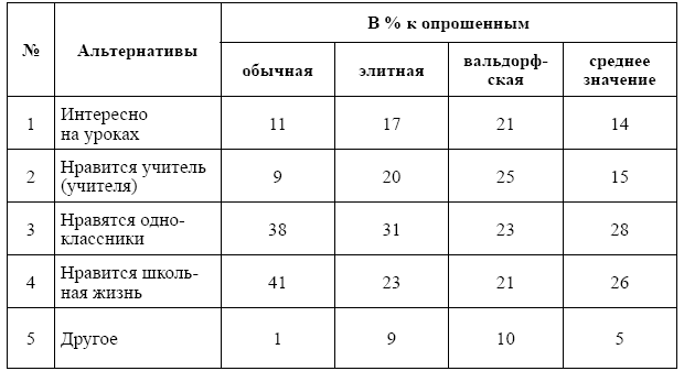 В приведенной выше таблице обращает на себя внимание, что ученики вальдорфской школы примерно в равной степени оценили все значимые факторы: интересно на уроках (21 %), нравятся одноклассники (23 %), нравится школьная жизнь (21 %), нравится учитель (25 %). Заметим, что оценка роли учителя в интересе к учебе выгодно отличает вальдорфскую школу от других школ. В обычных школах высоко оценивают своих учителей 9 % опрошенных, в элитной – 20 %. Среди свободных ответов есть очень показательные высказывания. Некоторым ученикам нравится сам дух вальдорфской школы, другие считают, что общая организация школы выгодно отличает ее от других учебных заведений. Высказывалось также мнение, что школа помогает обрести себя, стать независимой личностью.