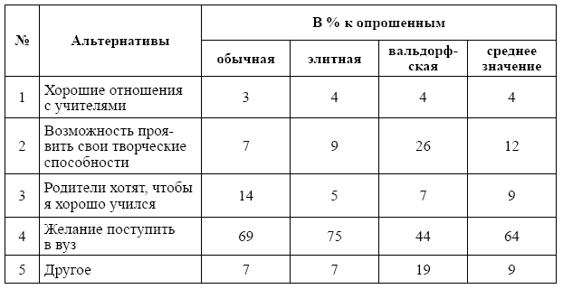 Данные приведенной выше табл. 20 показывают, что такой мотивационный фактор, как «стремление поступить в вуз», более всего влияет на желание учиться в элитной школе: 75 % опрошенных учеников элитной школы ответили, что желание поступить в вуз влияет на их отношение к учебе. В вальдорфской школе несколько иная картина: только 44 % опрошенных хорошо учатся для того, чтобы поступить в вуз, а 26 % (больше, чем в других школах) ответили, что им нравится учиться потому, что есть возможность проявить свои творческие способности.