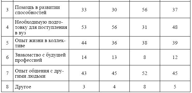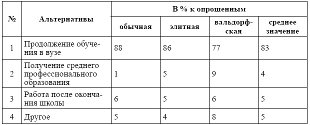 О том, что желание поступить в вуз не является доминирующей мотивацией, говорят также данные табл. 21. Из нее видно, что в вальдорфской школе меньше старшеклассников (77 %), ориентированных на высшее образование сразу после окончания школы. Сравним, в обычной школе подобный ответ дали 88 % учащихся.