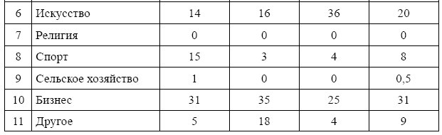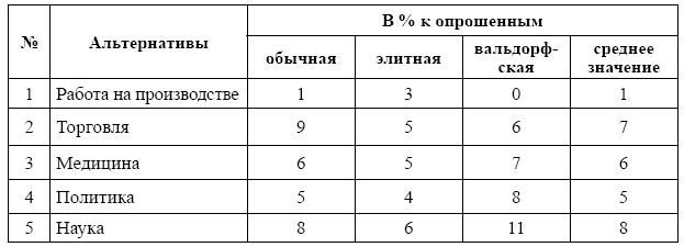 Данные табл. 22 очень показательны. Более всего у старшеклассников популярна сфера бизнеса. На это указали 35 % учащихся элитной школы, 31 % старшеклассников обычной школы и 25 % учеников вальдорфской школы. Но учащиеся вальдорфской школы отличаются от других школьников также повышенным интересом к искусству и науке. Соответственно на это указали 36 % и 11 % опрошенных.