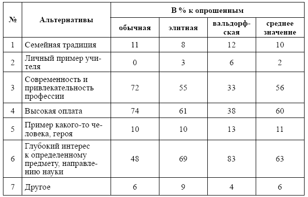 Данные, приведенные в табл. 23, отражают наиболее важные факторы, влияющие на выбор профессии. Налицо существенная дифференциация мотивов выбора профессии. Так, для учеников обычных школ, прежде всего, важна высокая оплата труда (74 % ответивших подобным образом) и современность, привлекательность профессии (72 %). Старшеклассники вальдорфской и элитной школ считают, что самое важное при выборе профессии – глубокий интерес к тому предмету, которым придется заниматься в жизни. На это указали 83 % опрошенных учащихся вальдорфской школы и 69 % учащихся элитной школы.