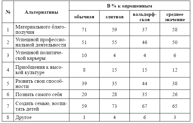 Анализ данных, приведенных в табл. 24, показывает, что среди жизненных целей наиболее приоритетными являются: достижение материального благополучия, успешная профессиональная деятельность, развитие своих способностей, создание семьи и воспитание детей. Но в каждом типе школ выстраивается своя система приоритетов. Так, ученики элитной школы самой важной целью считают создание семьи и воспитание детей. Подобным образом ответили 73 % опрошенных. Вторая по важности цель – достижение материального благополучия. На это указали 59 % учеников элитной школы. Третья – успешная профессиональная деятельность (55 % ответивших). Старшеклассники обычной школы на первое место ставят материальное благополучие (71 % ответивших). На второе – создание семьи и воспитание детей (59 % ответивших), на третье – успешную профессиональную деятельность (51 % ответивших). Ценностные приоритеты учеников вальдорфской школы отличаются, прежде всего, тем, что достижение материального благополучия в их системе ценностей даже не входит в тройку приоритетов. На этот фактор указали всего 37 % опрошенных. Для учащихся этой школы более всего важно создание семьи и воспитание детей (67 % ответивших), успешная профессиональная деятельность (46 % ответивших), развитие своих способностей (44 % ответивших). Причем повышенным вниманием к развитию способностей ученики вальдорфской школы заметно отличаются от остальных учащихся. В среднем на этот фактор указали только 38 % опрошенных.
