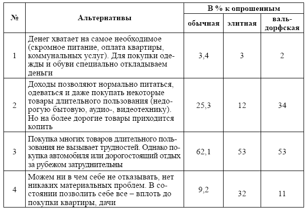 Ответы на вопрос: «К какому социальному слою относится Ваша семья?» приведены в табл. 26. Анализ данных этой таблицы показывает, что ученики вальдорфской школы происходят из семей, немного более обеспеченных, чем дети обычных школ. Но в элитной школе доходы родителей существенно выше.