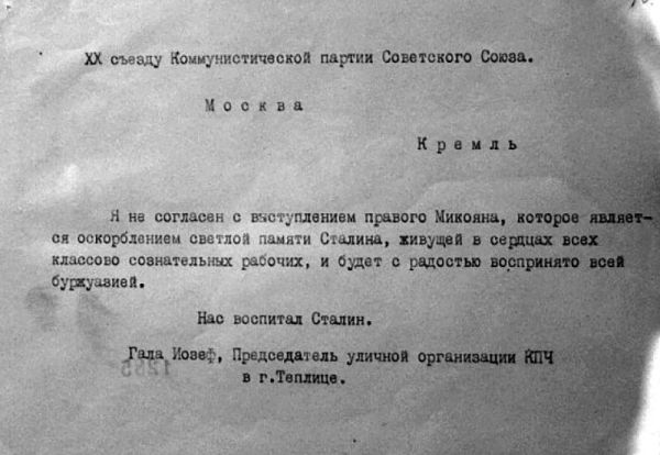 Одно из писем в президиум XX съезда КПСС, пришедшее в дни его работы из Чехословакии с осуждением на нем выступления А. И. Микояна (РГАНИ)[90]