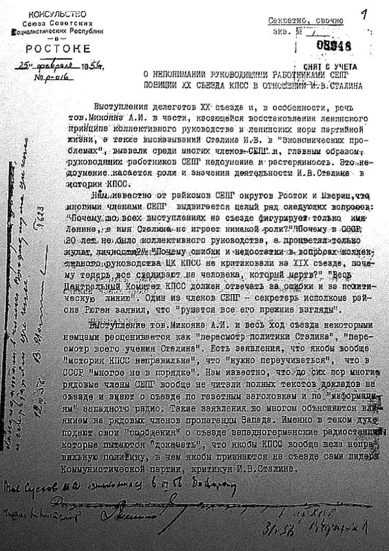 Нам известно от райкомов СЕПГ округов Росток и Шверин, что многими членами СЕПГ выдвигается целый ряд следующих вопросов: «Почему во всех выступлениях на съезде фигурирует только имя Ленина, а имя Сталина не играет никакой роли?», «Почему в СССР 20 лет не было коллективного руководства, а процветал только культ личности?», «Почему ошибки и недостатки в вопросах коллективного руководства ЦК КПСС не критиковали на XIX съезде, почему теперь все сваливают на человека, который мертв?», «Весь Центральный Комитет КПСС должен отвечать за ошибки и за политическую линию». Один из членов СЕПГ – секретарь района Рюген заявил, что «рушатся все его прежние взгляды».