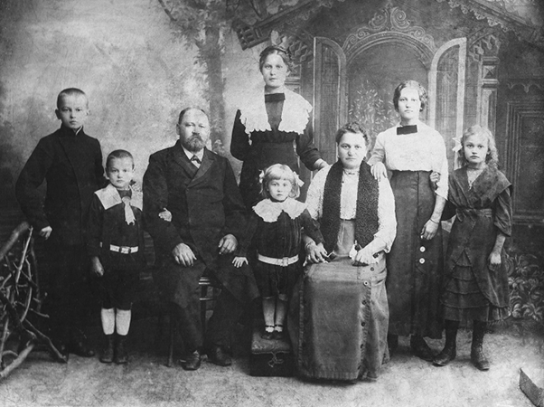 Наша латгальская семья: дед Антон Дементьевич Паукс и бабушка Лёся. Дети (слева направо): Янис, Александр, Антонина (стоит), маленькая Саля (Саломея) возле мамы, Амелия и Александра