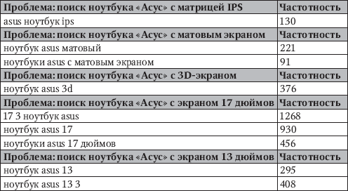 Самый простой способ обнаружить пустые запросы – ввести их в wordstat.yandex.ru в кавычках. В этом случае он отсекает производные и дает довольно точное число показов – правда, без учета словоформ. Далее необходимо высчитать соотношение реального числа показов к общему и отсортировать запросы по этому показателю. Запросы с наибольшим соотношением являются наиболее продуктивными. Запрос «квартиры под ключ» в этом смысле совершенно непродуктивен (на момент написания этого раздела соотношение было 206:15 956). С учетом того, какая конкурентная борьба разворачивается за 206 показов, его можно считать пустым и дать ему самый низкий приоритет либо вообще исключить из ядра.