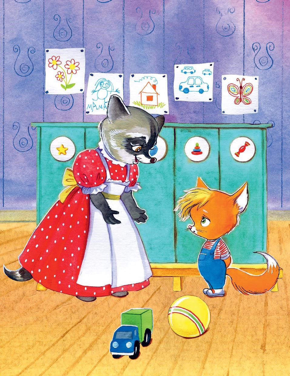 – Ты Мася? А я – твоя воспитательница, енотиха Ласка. Давай-ка посмотрим, где твой шкафчик… Ага, вот он.