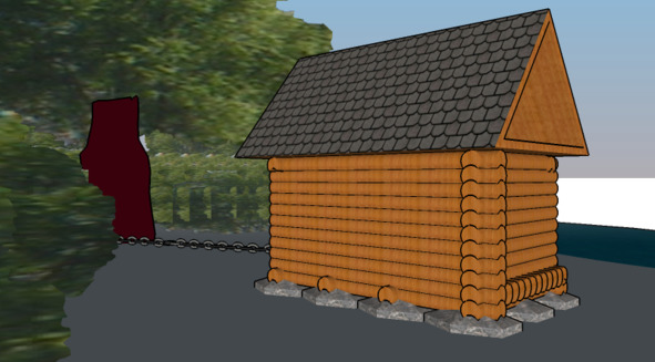 На поляне рос высокий толстый дуб. Почти рядом с ним стояла невысокая хижина из толстых бревен. С этого места они видели только две стены этой хижины. Ни окон, ни дверей на этих стенах, не было. К дереву одним концом была привязана толстая железная цепь. Другой конец цепи уходил куда-то за хижину. Вокруг поляны росли колючие кусты и только там, где стояли ребята, их не было.