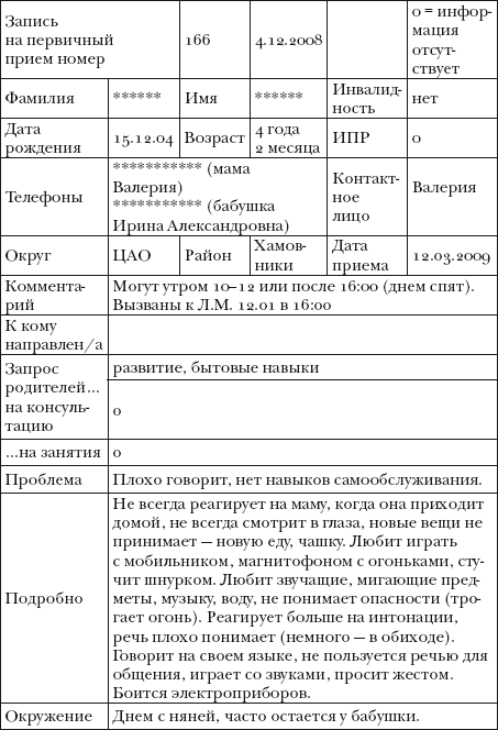 Таким образом, беседа во время записи на первичный прием позволяет нам представить себе характер нарушений ребенка и запрос родителей, а также выбрать педагогов для первичного приема. Родители в ходе разговора могут получить информацию о работе с детьми в Центре, о возможности юридической консультации, о других центрах, в которые можно обратиться за помощью, и о полезных книгах и Интернет-ресурсах, посвященных особым детям.