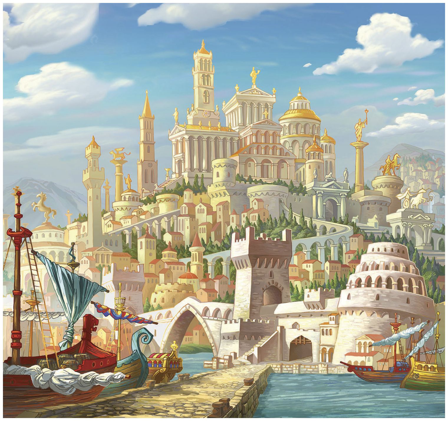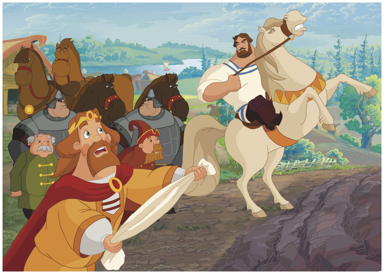 ⁂Только взошло солнце, богатырь уже был на коне и при оружии. Подошёл он к воротам княжеского дворца, те распахнулись, и оттуда сначала вышел небольшой отряд, за ним – повар с котлом, а следом скоморохи с песнями и плясками, а потом ещё один отряд, теперь уже конный. Завершал процессию сам князь на белом коне.