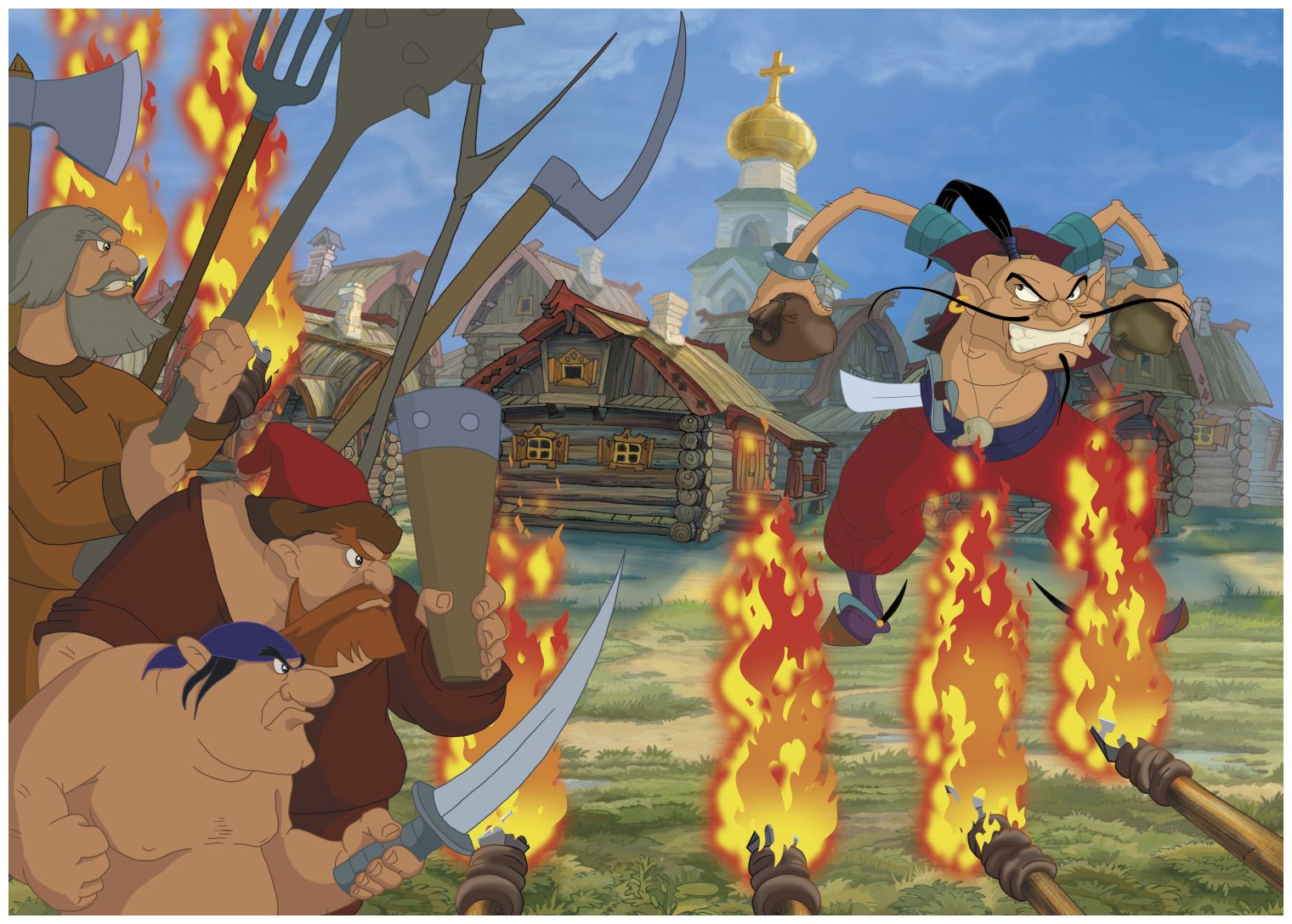 Жил народ на Руси да не тужил: леса были полны грибами и ягодами, а в реках плавали косяки рыб. На лугах паслись коровы, а в полях колосилась рожь. Крестьяне в поле работали, а урожай продавали в соседнем городе. Внезапно мирную жизнь нарушил неизвестно откуда взявшийся злодей, Соловей-Разбойник. Стал он жечь да грабить русские деревни.