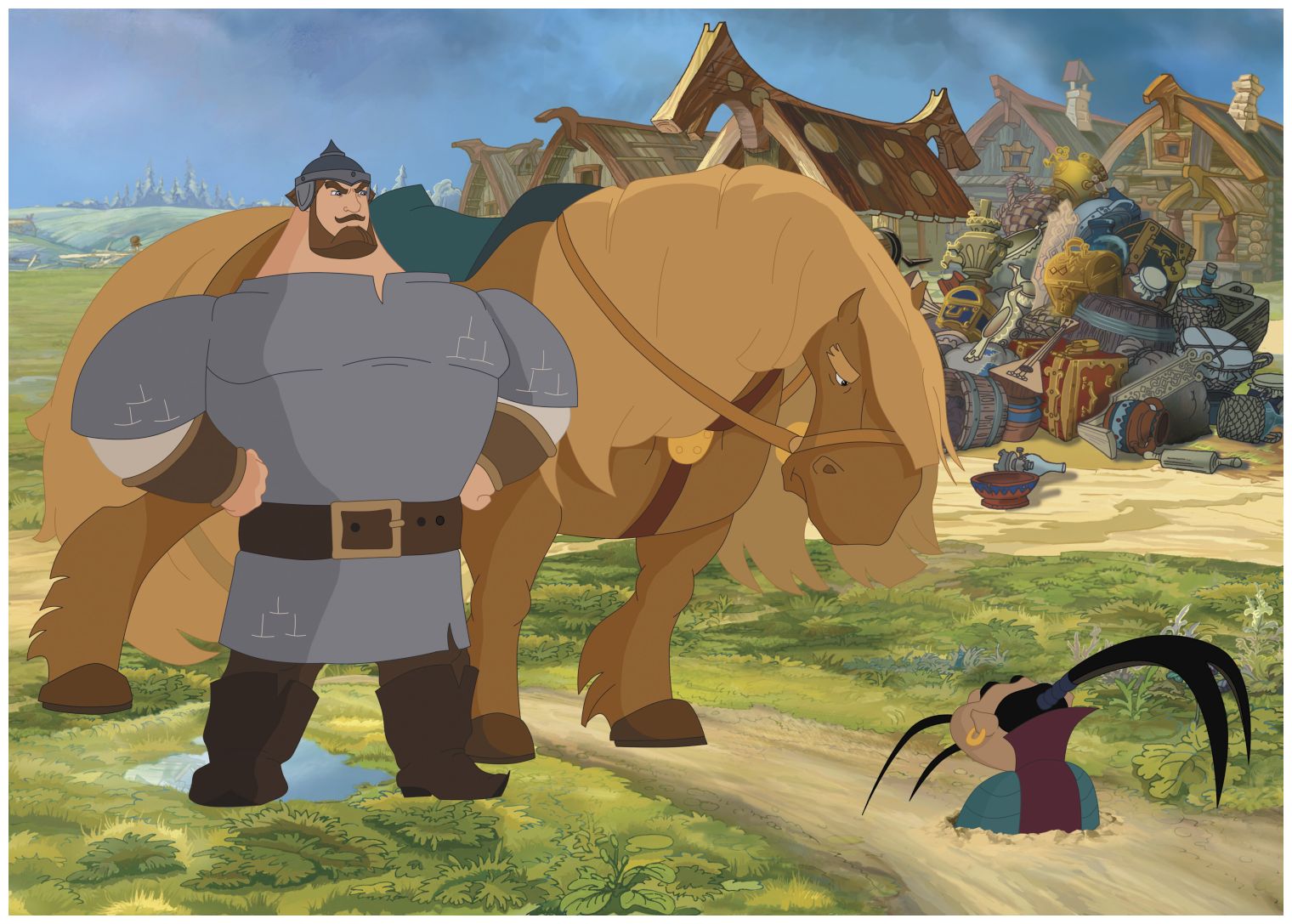 – Я-то пойду, князь, только на службу впредь меня не зови. Точка! – грозно сказал богатырь и, отстегнув от пояса меч, бросил его с такой силой, что князь, перепугавшись, спрятался под стол вместе с советником, который всё это время стоял рядом с бумагами в руках.