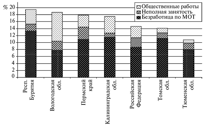 Рис. 1.3. Уровень безработицы по методологии МОТ, доля частично занятых и занятых на общественных работах на конец 2009 г.