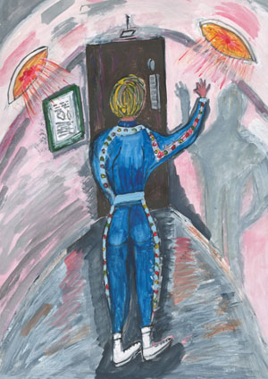 Выдумка КельвинаЖюль решила сначала сходить за скафандром для Гуппи. Повернув налево от душевой, вдруг увидела Кельвина. Она очень удивилась, что он так быстро вернулся от командира, хотела подойти к нему, чтобы напомнить, что его ждёт Гуппи. Но что-то удержало её, она остановилась, наблюдая за товарищем. Он, не замечал Жюль. Его лицо было сосредоточенно, будто бы он вслушивался в чью-то речь. Внимание подруги привлекла светящаяся точка, которая пробежала по руке Кельвина и тут же пропала. Через некоторое время точка появилась снова, тут же следом за ней, по костюму астронавта, пробежало множество таких же точек и исчезло. Девушка сразу вспомнила планету Драконов и роботов-надсмотрщиков. Там были тоже такое явление, только с лампочками. Тогда её друг пояснил ей его назначение: – Свечение точек означает передачу информации.