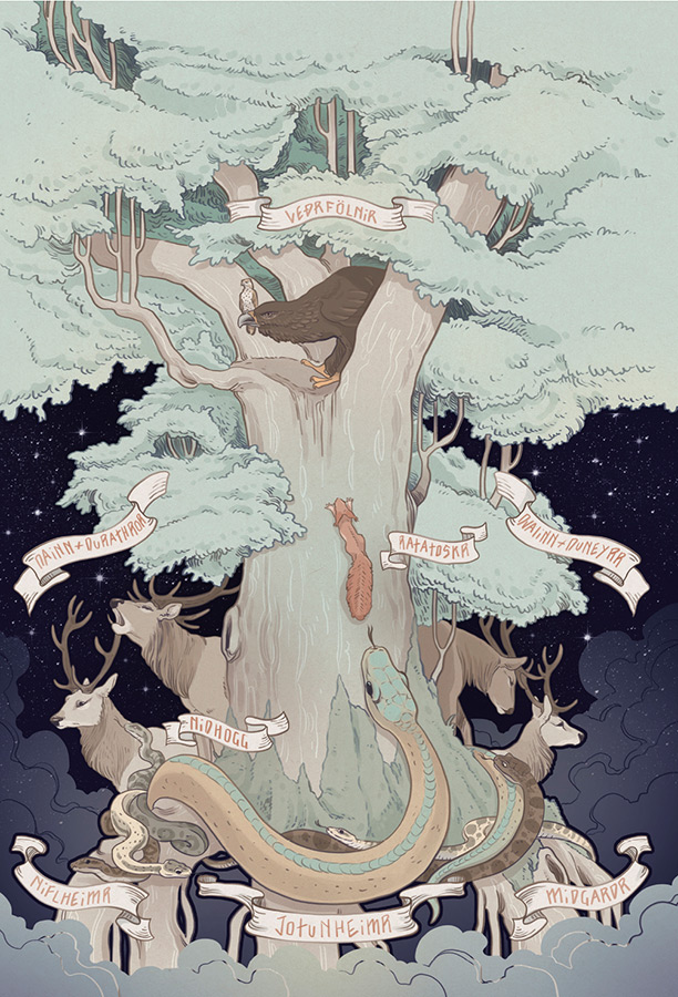 Четыре священных оленя – Даин, Двалин, Дунейр и Дуратрор – бродят вокруг древа и подскакивают вверх, чтобы сорвать его листья. На ветвях Иггдрасиля отдыхает Видопнир – золотой петух, чья песнь возвестит о конце света. Когда это случится, листья великого древа задрожат, что будет знамением грядущего конца времен, Рагнарёка, который утянет за собой все сущее. Из-за всех этих созданий, живущих среди его корней и ветвей, Иггдрасиль давно бы погиб, если бы не норны, которые постоянно ухаживают за ним, поливая водой из священного источника.