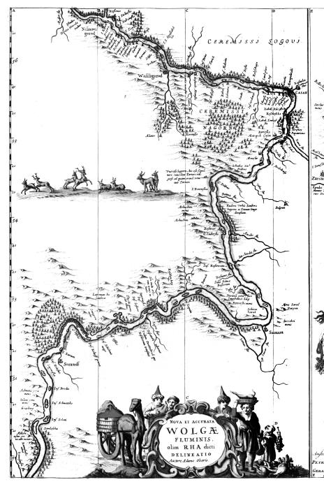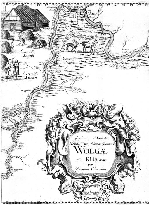 Рис. 53. Фрагмент старинной карты А. Олеария 1636 года. Здесь река Волга названа также именем Ра. Взято из [190], с. 88
