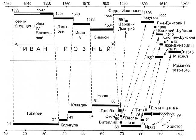 Рис. 55. Общая картина параллелизма между русскими царями-ханами эпохи 1530–1620 годов и «античными» римскими императорами якобы I–II веков. Сдвиг примерно на 450 лет