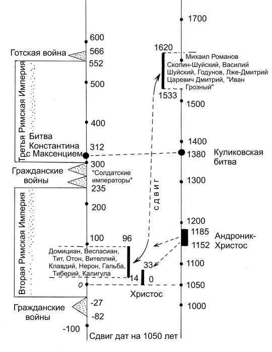 Рис. 56. Общая схема открытого нами параллелизма между «античной» римской историей якобы I века и историей Руси-Орды XVI – начала XVII века. К сдвигу на 1050 лет здесь добавился еще один сдвиг примерно на четыреста пятьдесят лет