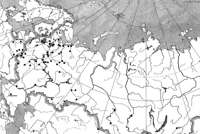 Рис. 57. Карта, показывающая распространение на Руси сказаний о камне Алатырь-Алтарь. Взято из [9:2], с. 17