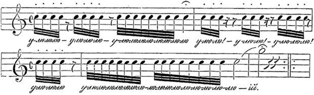 Илл. 4. Нотная запись охотничьего сигнала для борзой атаковать волка. По [Губин 1890]