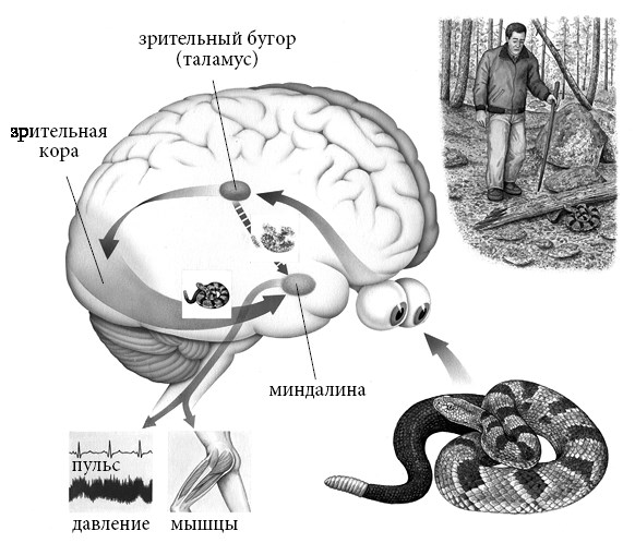 Своей известностью миндалина в большой мере обязана нью-йоркскому нейрофизиологу Джозефу Леду, чья книга «Эмоциональный мозг: таинственные основы эмоциональной жизни» (1996) была переведена на многие языки и стала бестселлером. Леду, который вместе с сотрудниками своей лаборатории играет на электрогитаре музыку в стиле heavy mental (sic!) в группе Amygdaloids, говорит о двух путях к страху: первый, быстрый, путь ведет через миндалину, а второй, немного медленнее, через кору мозга2. Когда мы воспринимаем угрожающий стимул (змею), эта информация, как пишет Леду, за 12 миллисекунд передается в миндалину, а та активирует вегетативную нервную систему для обеспечения реакции типа «борись или беги», сформированную в ходе эволюции живых организмов. Эта быстрая реакция может решить вопрос о жизни и смерти, потому что готовит тело к тому, чтобы убежать от угрозы силой или остаться и сражаться с ней. В два раза дольше, 24 миллисекунды, та же информация идет в кору головного мозга, где она оценивается: змея ли это в самом деле или просто палка, похожая на змею? Если это змея, то мертвая она или живая? Если она живая, то ядовитая это змея или безвредная? Если на самом деле опасности нет, то кора посылает сигнал миндалине, которая успокаивает вегетативную нервную систему3. Иллюстрация, приведенная Леду (см. ил. 1), производила настолько убедительное впечатление, что с 1996 года ее воспроизводили в публикациях о страхе, наверное, чаще, чем какую-либо другую4.