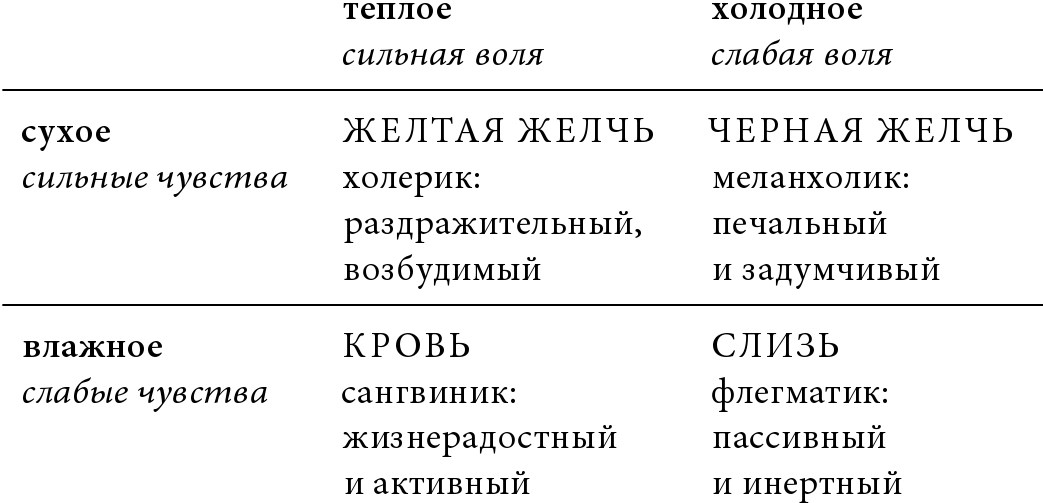Во II веке н. э. один греческий врач, находившийся под влиянием Платона, высказал мысли об эмоциях, оказавшие влияние на многие поколения арабских и европейских врачей вплоть до итальянского Возрождения: Гален (ок. 130 – ок. 200) создал учение о темпераментах, в котором он связал каждую из четырех жидкостей – кровь, слизь, желтую желчь и черную желчь – с двумя типичными качествами48. Избыток какого-нибудь одного из этих соков, считал Гален, приводил к тому, что в темпераменте человека проявлялись те или иные свойства.