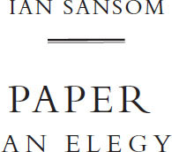 Any history of paper, it should further be said, for the purpose of clarification – and in particular this history of paper, which is not a history of paper – is not the same thing as a history of the book, nor indeed the same thing as a history of writing. There are plenty of such histories already. There was of course writing before paper, on birch bark, clay tablets, ivory, wood and bone, papyrus, palm leaves and silk. And there is writing after paper. There were also books before paper, on papyrus and parchment; and there are books after paper. Paper: An Elegy is not really about books, though books are undoubtedly one of the most ubiquitous of paper products. Nor is it a book about paper-making, in itself a vast and fascinating subject. Paper: An Elegy is, rather, an attempt to show how and why humans became attached to paper and became engrafted and sutured onto and into it, so that our very being might be described as papery.
