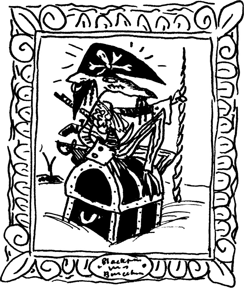 I thought, I know, give it a bit of a soapy lick, see who is under the dust. Then I found out. It is a fearsum old wolf plus beard, scar ect., all covered in guns and daggers! He has got a funny hat on with a mutton bones badge made out of jewels, all sparkly like his earring. He has got a crool, teasy look on his face, plus he is sitting on a big strong old chest. In his paw he is holding a long twisty stick, looks like coff candy, only made of elephant tusks, maybe.