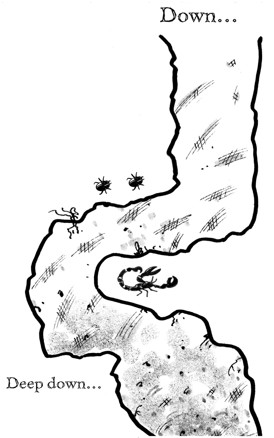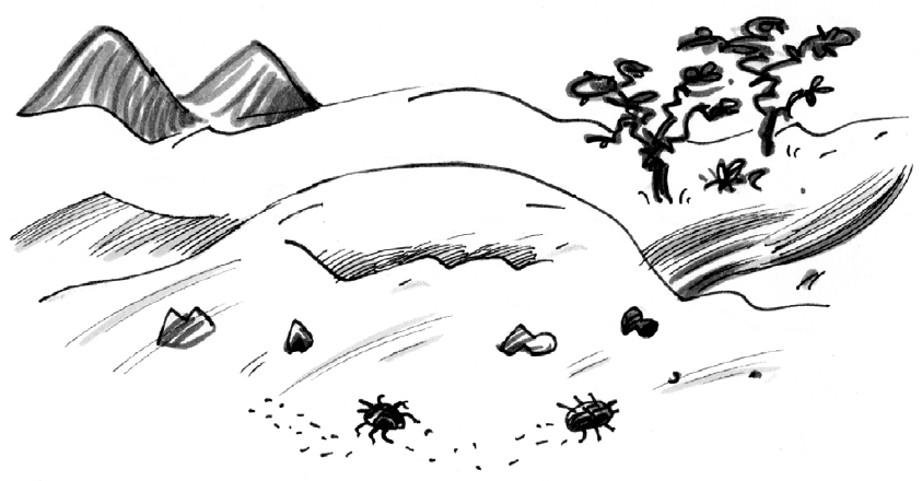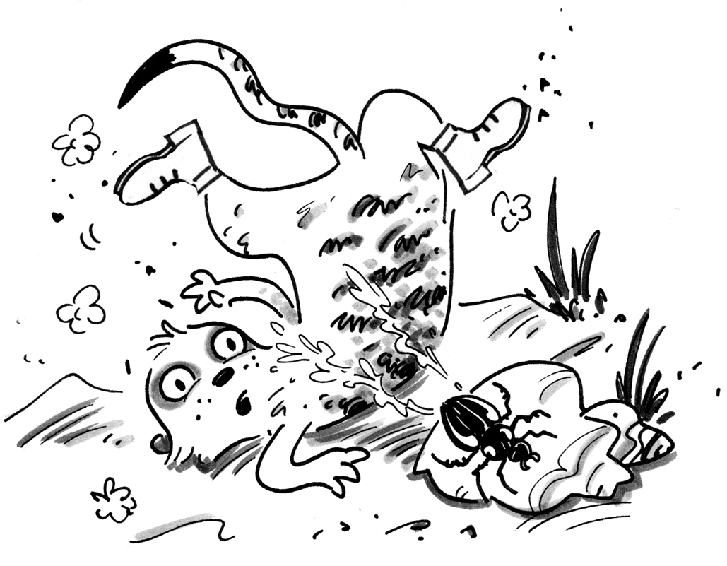 Skeema was chasing ants, throwing up a shower of hot sand to get at some of their eggs, when he suddenly came face to face with a crawler he hadn’t met before. It was a shiny black beetle with white marks on its cheeks. It seemed to be tucking into the ants itself and was waving its long legs and pincers in a wild sort of way. Skeema was very fond of his food, especially scorpions, so he was used to the darting and threatening tricks that many delicious creatures use to try to avoid getting eaten. In fact, the sheer cheek of the little creature made him determined to find out what it tasted like. He lowered his nose almost to the ground to get within nibbling range. Then he began to knock the beetle about with his paw.